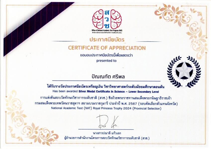 41) รองชนะเลิศอันดับที่ 1. ระดับจังหวัด . 80 (17 มกราคม 2568) แข่งขันสอบวัดทักษะวิชาการระดับชาติ (เพลินพิศ)