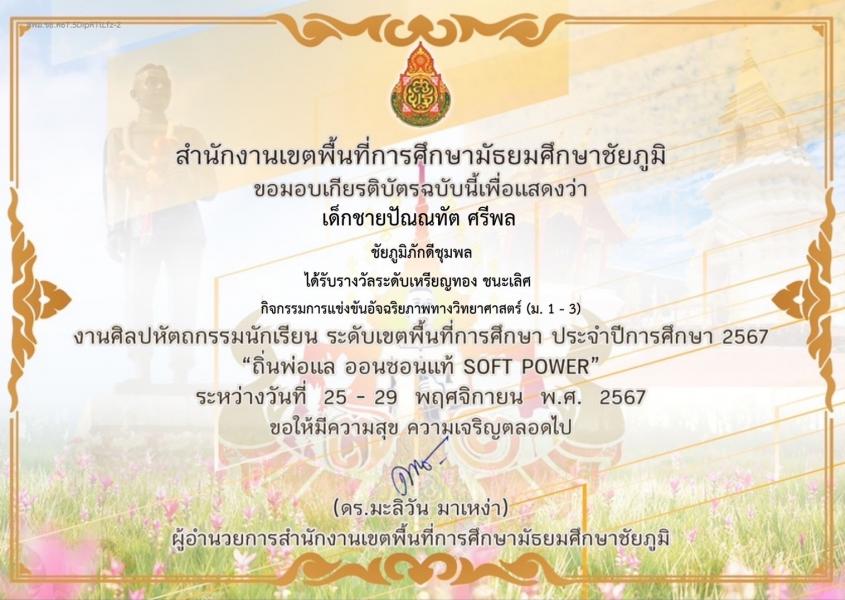 42) ชนะเลิศ ระดับจังหวัด . 100 (17 มกราคม 2568) ชนะเลิศ แข่งขันศิลปหัตถกรรมนักเรียน (เพลินพิศ)